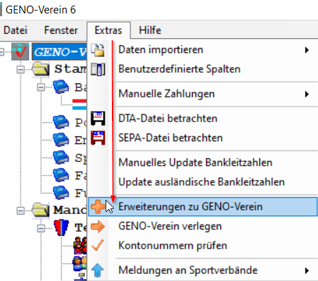 Schritt 1 im Menüpunkt "Extras" und "Erweiterungen zu GENO-Verein":